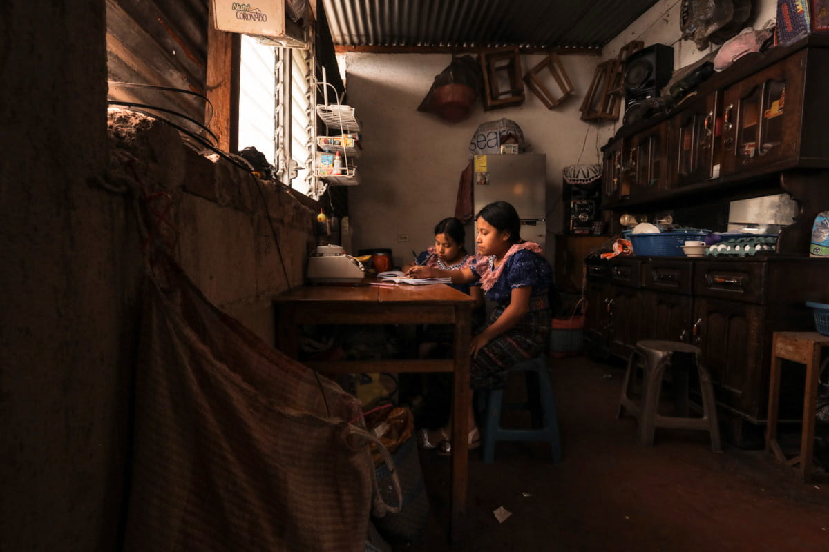 Sponsored twins Luisa and Dulce, 12, complete their homework in the kitchen of their family’s home in Guatemala. With assistance from the sponsorship benefit, 100% of sponsored children in Unbound’s programs have the opportunity for an education.
