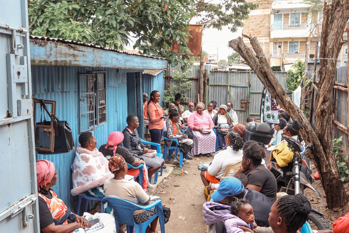 Rachael Muthoni, Unbound Nairobi social worker, addresses a mothers group gathered for a training session.