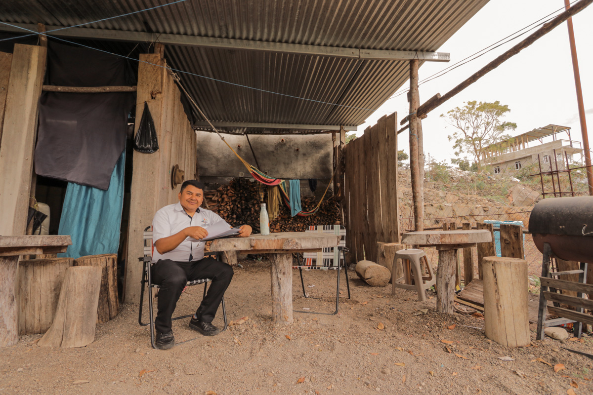 Unbound Guatemala Director of Program Evaluation Andrés González Peneleu gets set up at the home of a family to check in about their progress with Poverty Stoplight goals.