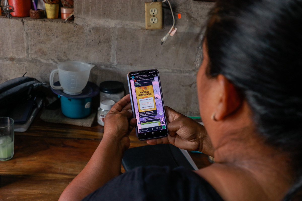 Gloria checks her son Omar’s cash-transfer benefit deposit via a mobile app. For banking, Gloria often must travel an hour-and-a-half from her rural community in El Salvador to make a withdrawal.