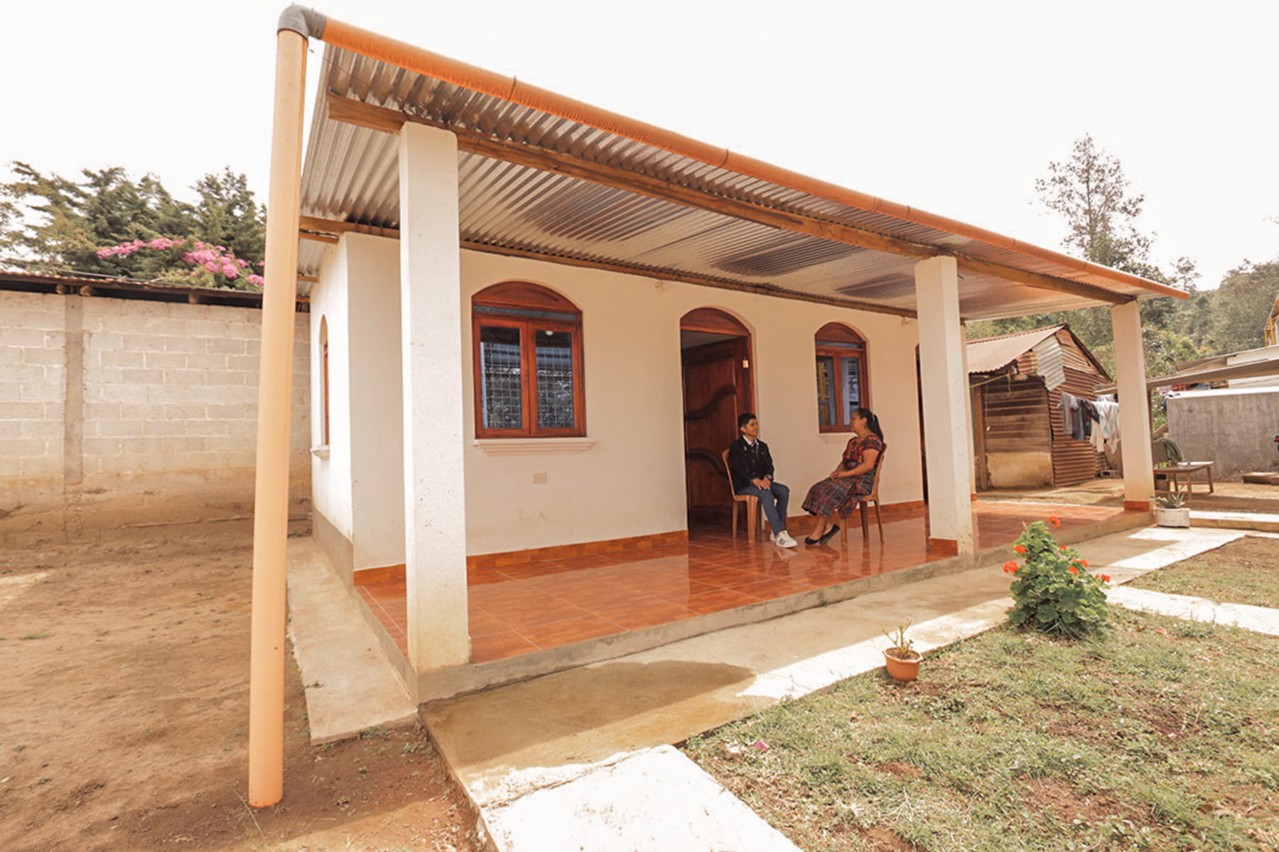 Débora and her son, Hamilton, 17, sit on the porch of their new 387-square-foot home in Guatemala they built as part of their first Poverty Stoplight goals.
